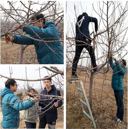 为了实际感受农民劳作之辛苦,帮助他们做力所能及的工作,1月15日清晨,队伍跟随60多岁的刘大爷来到了他家的苹果园里帮助他修剪果树。刘大爷言传身教的为我们讲解了修剪技巧,我们也结合平时课本所学知识,很快掌握了要领:修建果树的目的是让来年取得更高的产量,所以要剪掉新生的向上生长的枝条,保留几支主要的副枝,保证各支之间不会互相遮挡阳光。一行人爬高上低,剪刀锯子齐上阵,在不断的交流学习与拉家常中度过了充实的一天。