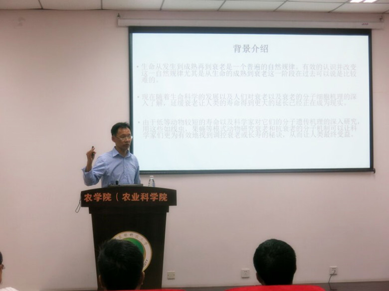 应我校农学院胡胜武教授邀请,美国密西根州Ferris州立大学(Ferris State University)生命科学系朱昌棋副教授于近日来校进行学术交流,并于近日,在农学院216报告厅,朱昌棋副教授做了一场题为“用模式动物果蝇研究Activin信号传导系统在衰老和抗衰老过程中的作用”的报告。报告会由农学院院长助理韩娟主持,来自农学院、生命学院、植保学院等相关专业的教师和研究生一同听取了本次学术报告。