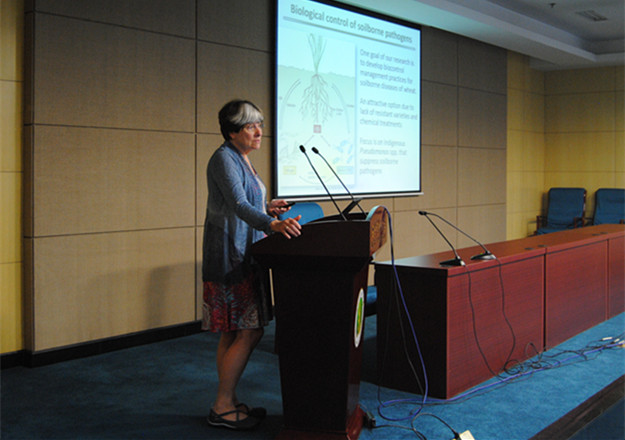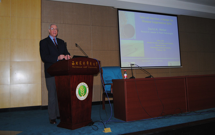 7月5日在国际交流中心104报告厅两位教授分别做了“Take-All Decline: A Model for Disease-Suppressive Soils”和“Control of Cereal Root Pathogens with Root-Associated Bacteria”的学术报告,David Weller 教授对美国西北地区自然衰退土壤的形成机理、产生DAPG抗生素的荧光假单胞菌株的作用机制以及自然衰退土壤用于其它病害防治的进一步利用等方面进行了详细的讲解。LindaTomashow 教授对假单胞菌产生吩嗪类抗生素的种类、调控机理、对土传病害的防治机制等进行了讲解,同时指出PCA可以促进植物根际生物膜形成,但并不会促进植物对Fe和Mn的吸收。来自农学院、生命学院、植保学院等相关专业的教师和研究生共100余人参加了学术报告并积极交流。