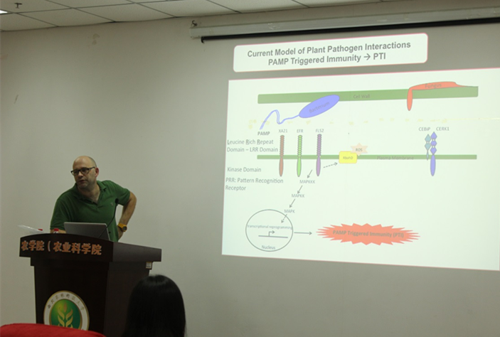 7月31日,应农学院院长单卫星教授邀请,我校“作物抗病育种与遗传改良创新引智基地”111项目(培育)海外专家-德国吉森大学植物病理研究所Jens Steinbrenner博士来农学院进行学术交流。