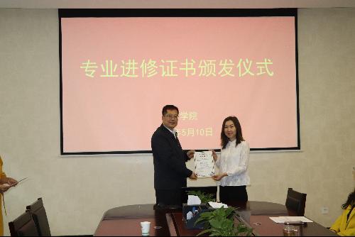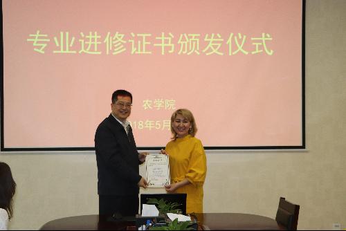 5月10日,农学院在农科楼203会议室为来校进行专业进修的北哈萨克斯坦国立大学农学院院长阿丽腾·沙亚克麦托娃、青年教师阿依努拉颁发专业进修证书。副校长罗军、国际处处长余劲、农学院院长单卫星与有关负责人参加了此次仪式。农学院党委副书记张海成主持仪式。