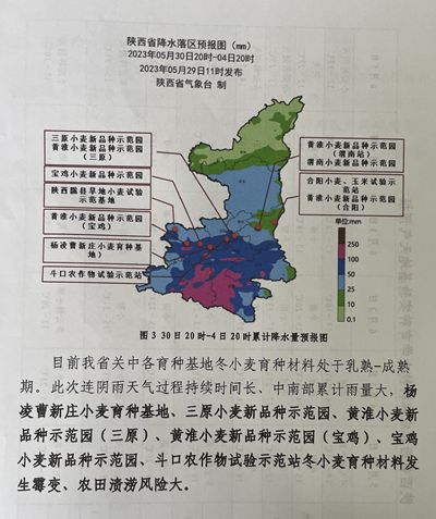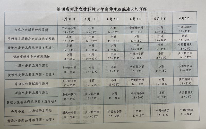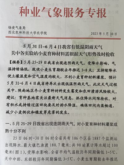 当前正值夏粮收获关键期,杨凌及周边地区出现大面积持续性降雨过程,为夏粮抢收和小麦育种材料收获带来严峻挑战。为切实加强连阴雨天气防范应对,全力以赴抢收减损保夏粮丰收,杨凌气象局与我院联合发布《关于做好近期连阴雨天气防范应对强化小麦育种材料抢收的紧急通知》,同时发布《种业气象服务专报》,提醒各育种基地抓住降水间隙,及时抢收晾晒育种材料。