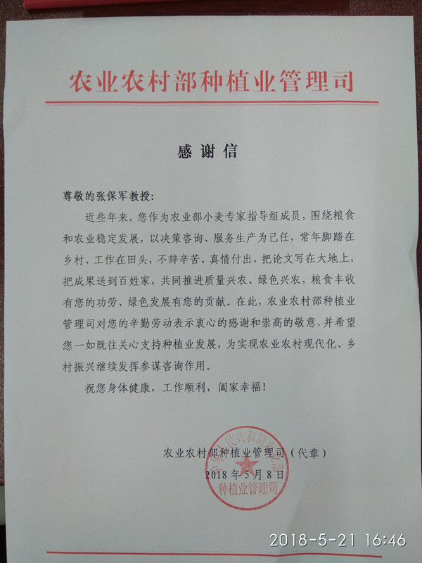 近日,我院收到农业农村部种植业管理司的感谢信,表扬柴岩研究员和张保军教授。