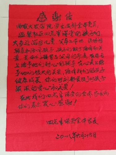 信中写道:温馨社区四点半课堂的孩子们大多为留守儿童,父母工作忙,没时间辅导和陪伴孩子,孩子们缺少陪伴和关爱,是你们接管了父母的职责,在学习上给予他们耐心的辅导,在心灵上给予他们很大的关爱,陪伴我们的孩子健康成长,你们时刻都展现了对孩子浓浓的爱心和关爱!在此,我们四点半课堂的全体家长向你们表示衷心感谢!