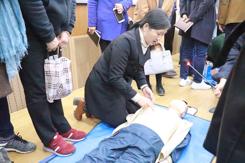 副主任医师陈宁大夫通过深入浅出、图文并茂的方式向大家讲解了心肺复苏急救相关知识,并对其中的重点环节和注意事项进行了重点介绍。讲解后还和学院老师一起进行了心肺复苏实际操作。
