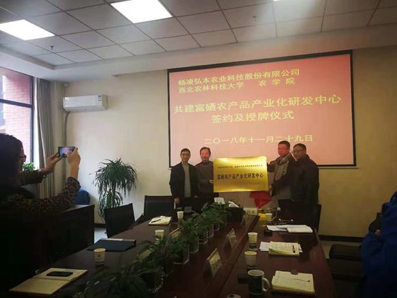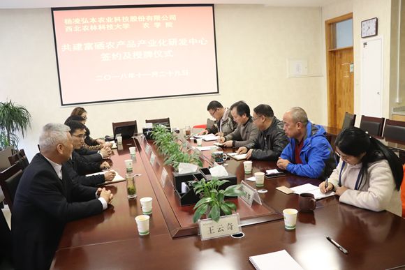 2018年11月29日,农学院与杨凌弘本农业科技股份有限公司共建富硒农产品产业化研发中心签约与授牌仪式在我校举行。院党委书记张海成、杨凌弘本农业科技股份有限公司董事长陈金国、公司顾问赵德兴、推广处张正新副处长、党委副书记吴清华、张睿研究员、刘曼双研究员以及弘本农业科技股份有限公司相关人员参加了会议。签约仪式由副院长郭东伟主持。张睿研究员代表学校联系人同杨凌弘本农业科技股份有限公司董事长陈金国签署了合作协议。张海成书记、陈金国董事长、张正新副处长和郭东伟副院长共同为“富硒农产品产业化研发中心”揭牌,标志着校企共建的农产品产业化研发中心正式运行。