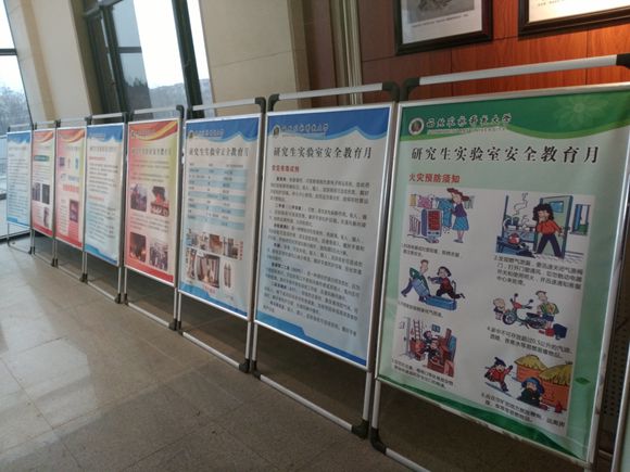 在工作区域张贴安全标识,所有实验室墙上悬挂安全纪律制度,发布实验室安全应急指南和安全应急疏散指示图,举办研究生实验室安全教育图片展,实验室安全视频征集等活动;通过宣传册、电子显示屏、横幅、学院主页、微信、QQ等多种途径开展安全知识宣传教育活动,积极营造消防安全的舆论氛围。