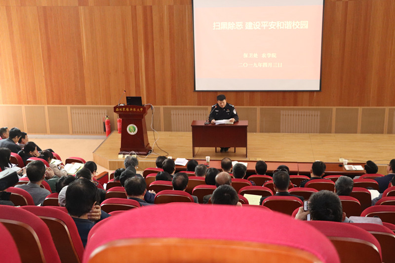 4月3日,农学院联合校保卫处特邀杨凌示范区公安局赵广副局长为学院教职工做扫黑除恶专题宣讲,学院全体教职工、保卫处全体职工近200人参加了会议,会议由学院党委书记张海成主持。