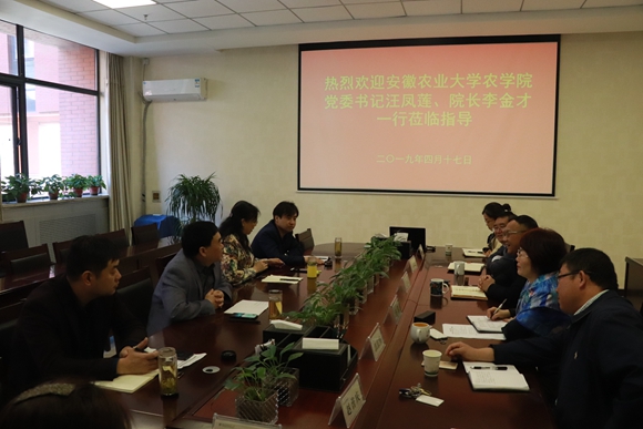 2019年4月17日,安徽农业大学农学院党委书记汪凤莲、院长李金才、副院长武力权、办公室主任宋超一行4人来学院交流访问,调研作物学学科与实验室建设、人才培养、基地建设、社会服务,与学院领导班子成员进行了座谈和交流。党委书记张海成代表学院对客人来访表示热烈欢迎,同时向客人介绍了学校学院基本情况。各分管领导先后介绍了学院科学研究、基地建设、社会服务、学科建设和学生培养的基本情况,双方就有关话题进行了探讨和交流。