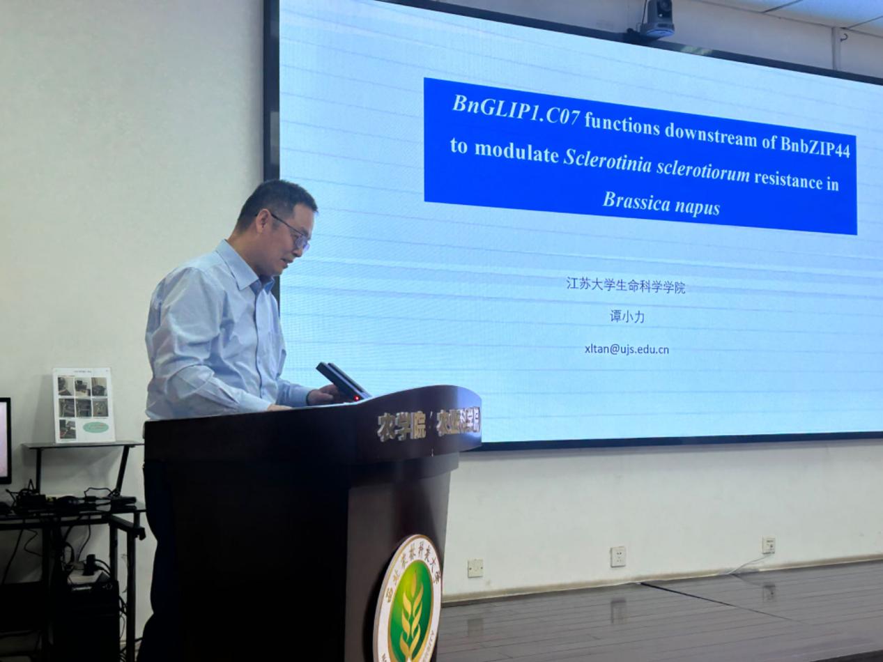 谭小力研究员则深入讲解了菌核病对油菜生产的危害,并分享了 bZIP44 转录因子如何调控下游基因 GLIP1 ,进而影响油菜对菌核病抗性的最新研究成果。谭老师的报告不仅让同学们对研究思路有了清晰的认识,也为未来的科研工作提供了宝贵的参考和灵感。