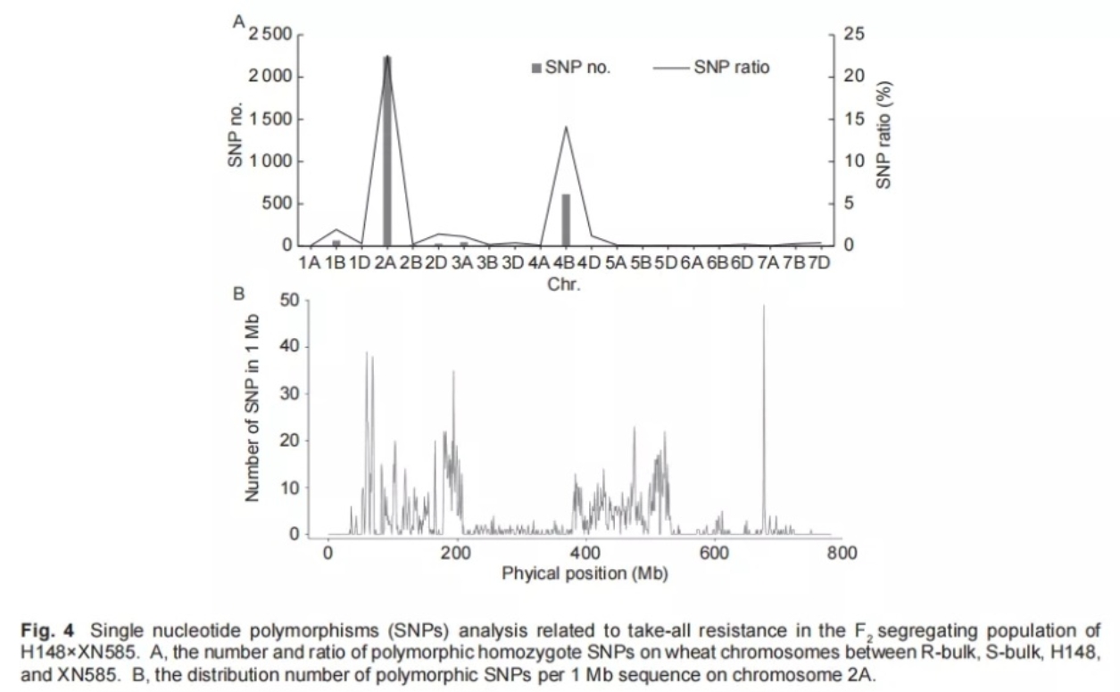 以抗病亲本华山新麦草和感病亲本7182作为对照处理,经全蚀病鉴定发现,H148的抗性介于两个亲本之间,相比感病亲本7182,H148的抗性得到显著的提升。同时,利用植物数量遗传遗传体系“主基因+多基因”混合遗传模型分离分析法解析了小麦-华山新麦草渗入系H148对全蚀病的抗性受到两对主效基因的共同控制,且存在一定的加性、显性和上位性效应。同时,结合集群分离分析法(BSA)和小麦660K基因芯片筛选出与抗性相关的外源特异性SNP,主要分布于小麦的2A染色体。根据特异SNP开发竞争性等位基因特异性PCR(KASP)分子标记对遗传群体进行基因分型,最终在小麦2A染色体上定位到一个与全蚀病相关的QTL。经候选基因预测发现,两个与系统性提升植物根系抗性相关的基因被预测可能参与了小麦对全蚀病的抗病反应。