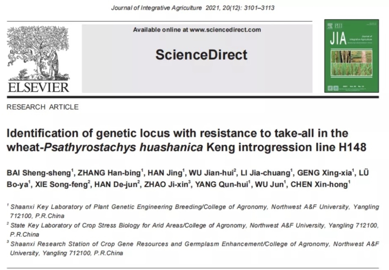 近日,农学院小麦远缘杂交遗传育种团队在Journal of Integrativegriculture(《农业科学学报》(英文)发表了题为《Identification of genetic locus with resistance to take-all in the wheat-PsathyrostachyshuashanicaKeng introgression line H148》的论文。陈新宏研究员博士毕业生白升升为该文章第一作者,陈新宏研究员、武军教授为该文章的通讯作者。