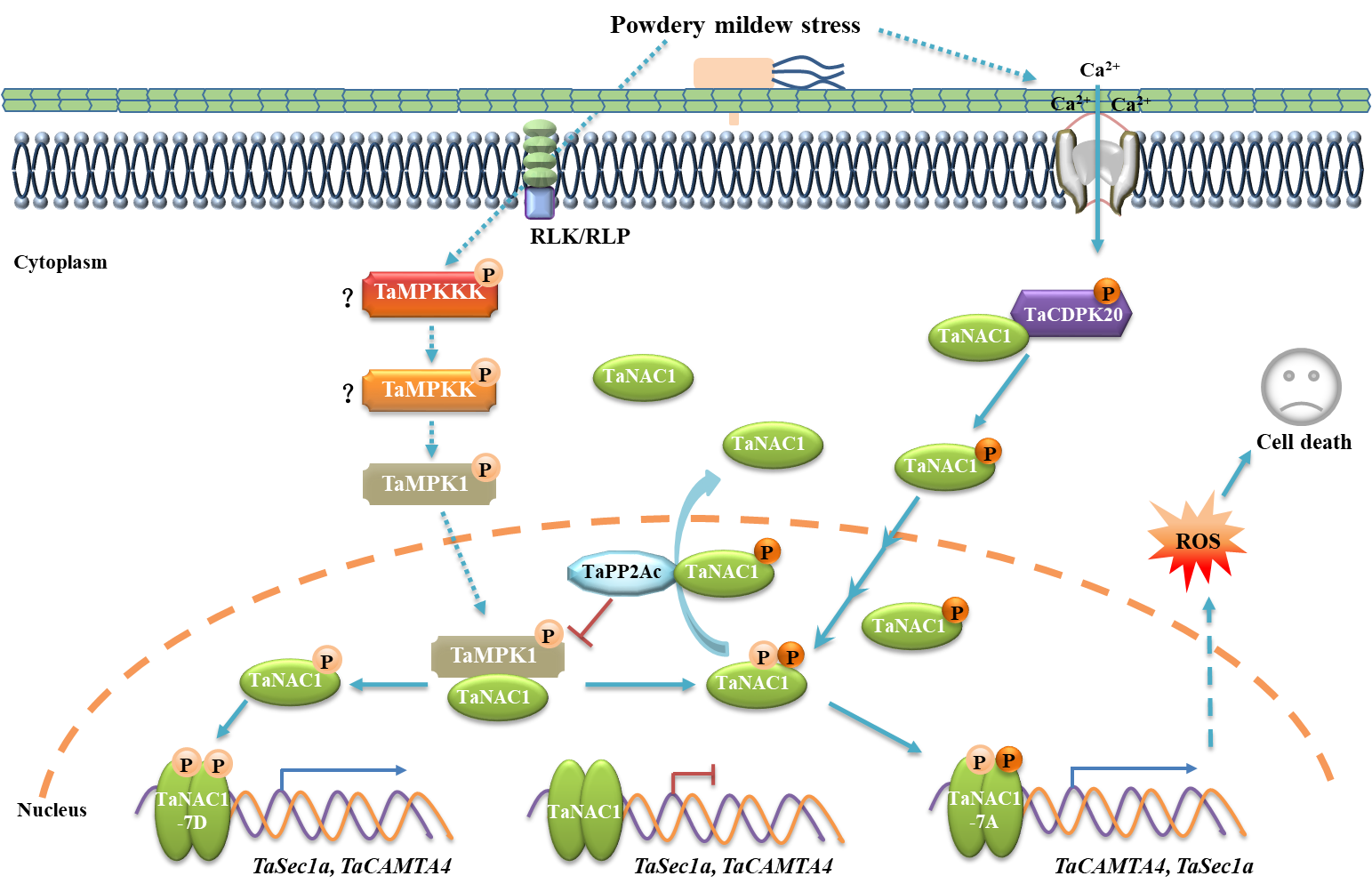 图2. TaCDPK20/TaPP2Ac开关及其在CDPK20/TaMPK1-TaNAC1-TaSec1a/TaCAMTA4级联通路调节细胞凋亡和白粉病抗性中的作用模型图