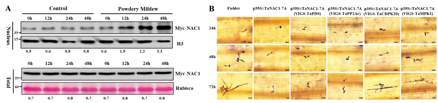图1.白粉病胁迫对NAC1蛋白核聚集及其活性调节蛋白对小麦白粉病抗性的影响