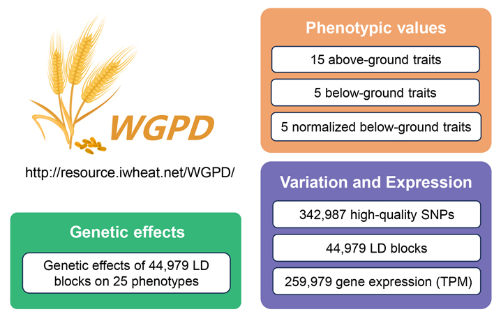 此外,该研究还搭建了开放型小麦基因型和表型数据库WGPD(Wheat Genotype and Phenotype Database,http://resource.iwheat.net/WGPD/),整合了研究过程中所产生的小麦地上和根系相关表型、基因型、基因表达量、基因组连锁区段对每个表型的遗传效应等数据(图2),并提供查询和下载通道,为小麦其他重要农艺性状的研究提供了数据支撑。