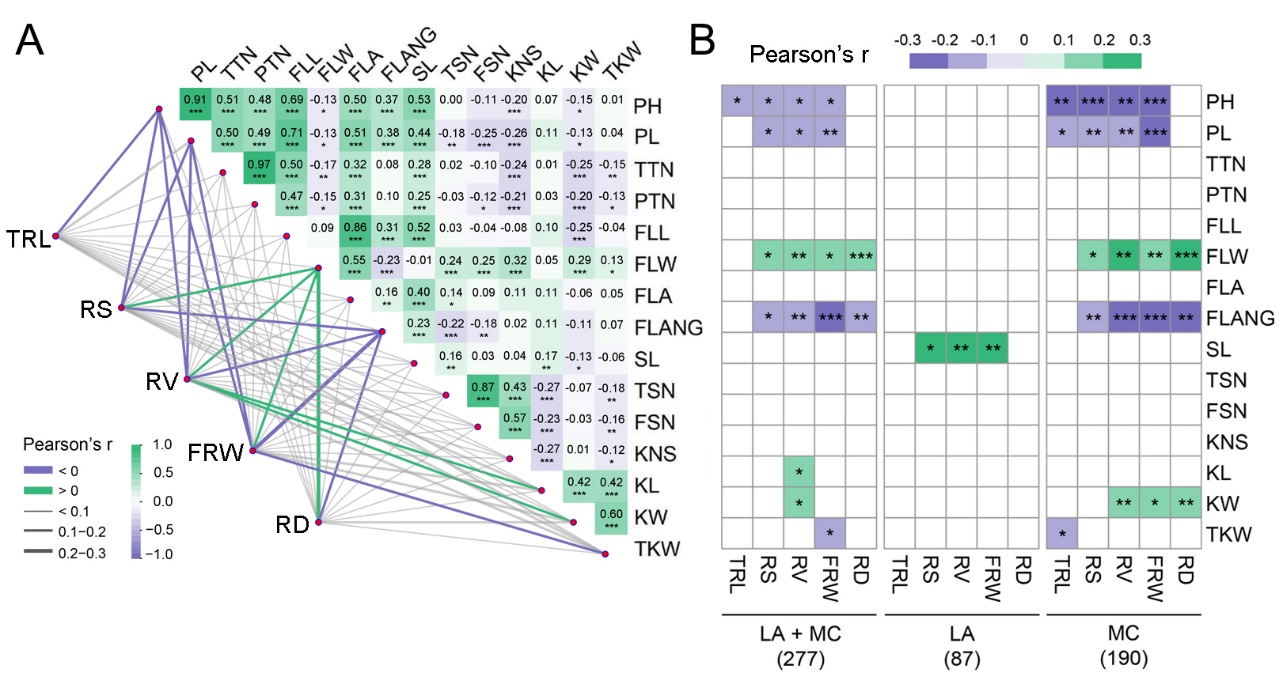图1. 根系与地上表型相关性。LA:农家种,MC:现代栽培种。