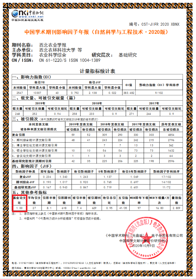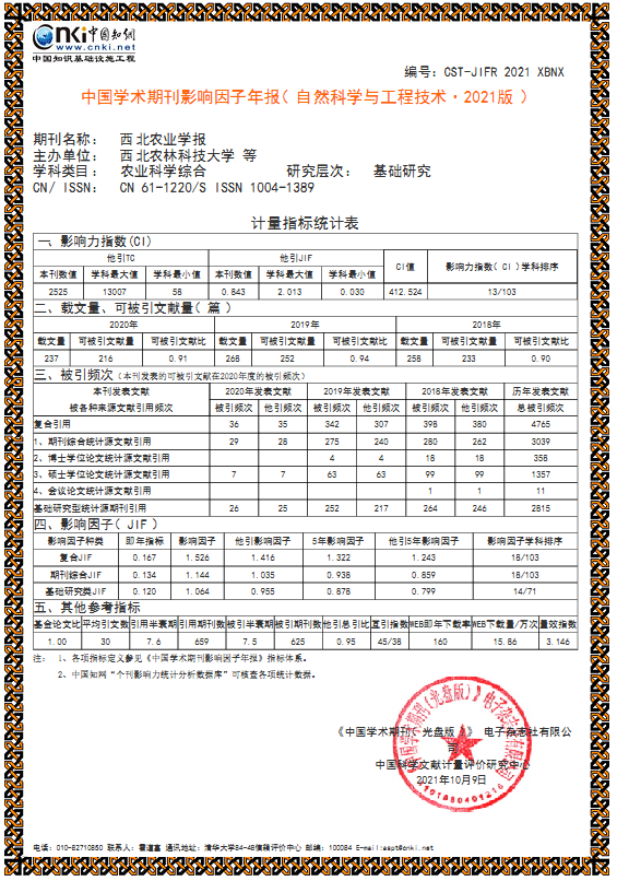《西北农业学报》影响力指数(CI)从2020版的383.482,提升至2021版的412.524,增幅7.57%,学科排名第13,处于Q1区;复合影响因子从1.340提升至1.526,增幅13.88%,学科排名第18。