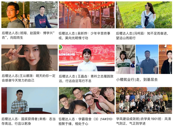 以典型培育为驱动,搭建网络思政育人平台。表彰并宣传一批先进个人与集体,依托新媒体平台,打造学院特色“后稷达人志”专栏,定期推送榜样事迹,对学院保研学子、国家奖学金获得者、学霸宿舍、先进班集体、优良学风示范班进行宣传展示,分享个人学习经验与班级学风建设经验,树立榜样,营造学院整体“比学赶帮超”氛围,通过“一线挖掘-持续培育-宣传表彰”三步工作法,形成一个典型带出一批典型的“葡萄串效应”,立体式、多维度、全方位激发学生学习兴趣和内生动力,持续增强学风建设效能。