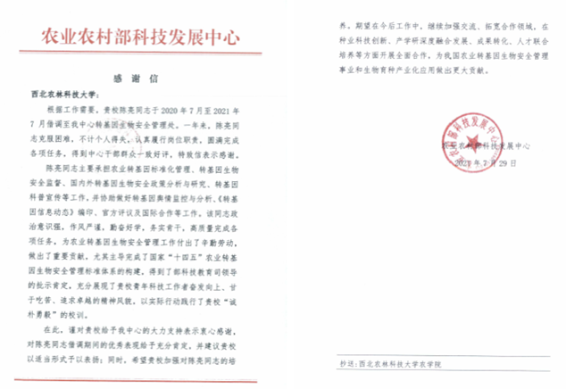 近日,农业农村部科技发展中心向学校发来感谢信,对我院陈亮副教授借调至农业农村部科技发展中心转基因生物安全管理处一年来开展的工作予以充分肯定,并表示了衷心感谢。