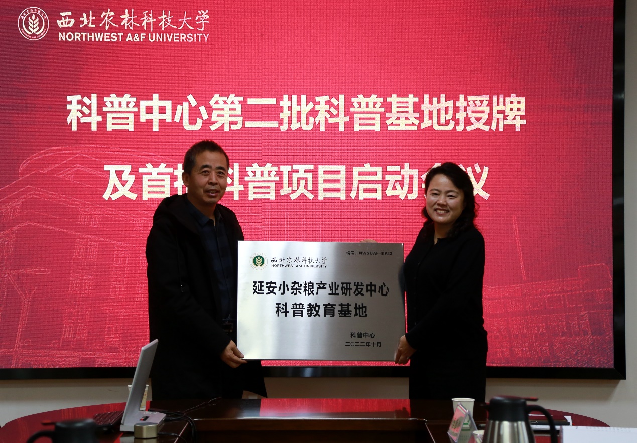 11月29日,西北农林科技大学科普中心举行第二批科普基地授牌及首批科普项目启动会议,延安小杂粮产业研发中心成功入选西北农林科技大学第二批科普基地。副校长赵敏娟教授、科普中心主任傅朝荣、副主任张正新、副主任李景星、授牌基地及立项基地相关负责人参加会议,会议由博览园张振华副主任主持。