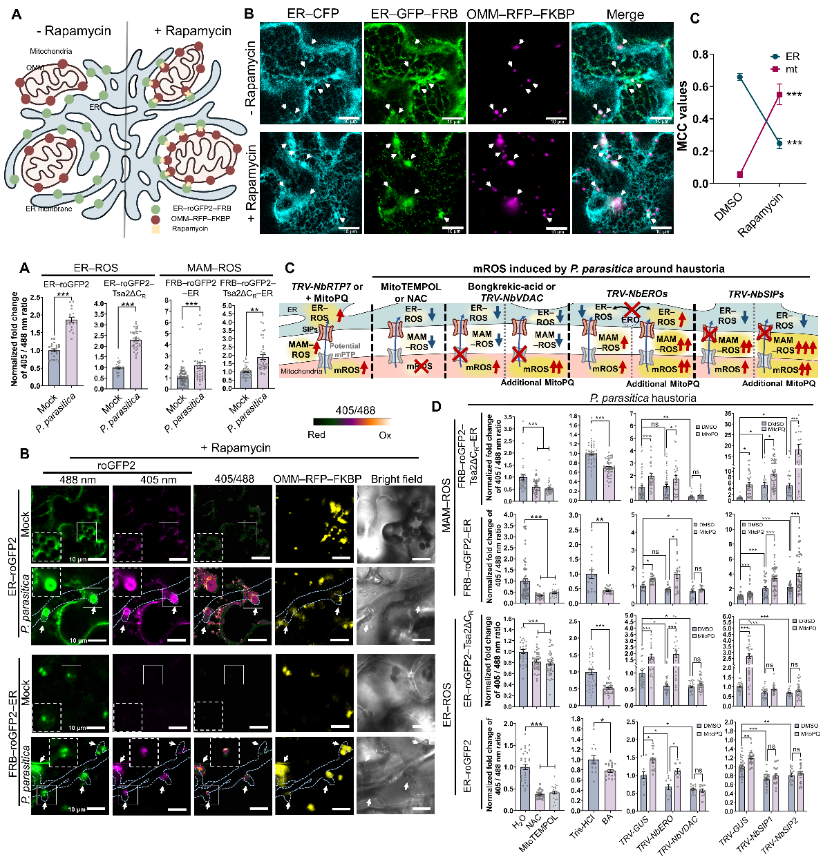 由于现有的ROS染色方法无法为MAM位点ROS的观察提供足够的分辨率,作者基于FKBP-rapamycin-FRB互作原理,通过Rapamycin处理,将ROS生物感应器定向聚集于MAM位点,实现了植物体内MAM-ROS的实时检测;分析发现,高水平mROS促进MAM-ROS迸发,并进一步提高内质网ROS水平;结合植物突变体遗传分析与多种化学抑制剂处理,明确了寄生疫霉吸器周围存在线粒体—MAM—内质网ROS信号转运通路,且是调控植物免疫激活的关键 (图3)。