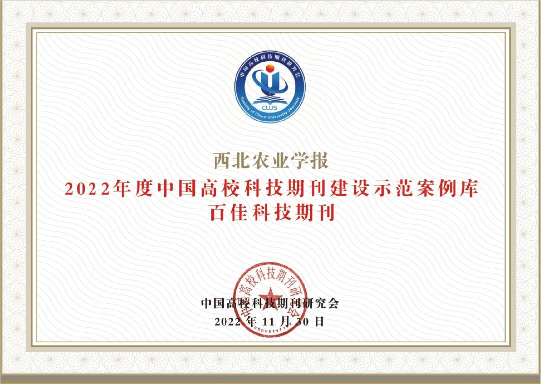 为了不断提升高校科技期刊的创新力、影响力、贡献力和编辑出版质量,对高校科技期刊在科研活动和学术交流中的作用及其质量进行客观、全面的评价,以树立典范、明确方向,促进高校科技期刊更快发展,中国高校科技期刊研究会举办2022年度中国高校杰出•百佳•优秀科技期刊遴选活动。此次评选,《西北农业学报》被评为“2022年度中国高校百佳科技期刊”,这是本刊连续3届获此殊荣。