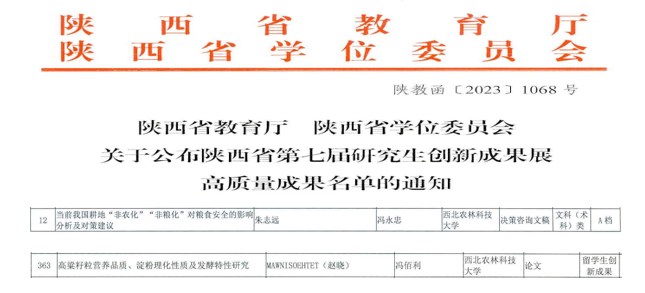 我院本次参展作品经个人申报、学院专家评审、学院推荐、学校评审、学校推荐、材料初评、网络评审和会议评审等环节评审后,冯永忠教授指导的朱志远博士研究生作品——当前我国耕地“非农化”“非粮化”对粮食安全的影响分析及对策建议获文科类A档;冯佰利教授指导的留学生MAW NI SOE HTET(赵晓)博士留学生作品——高梁籽粒营养品质、淀粉理化性质及发酵特性研究论文获留学生创新成果奖。