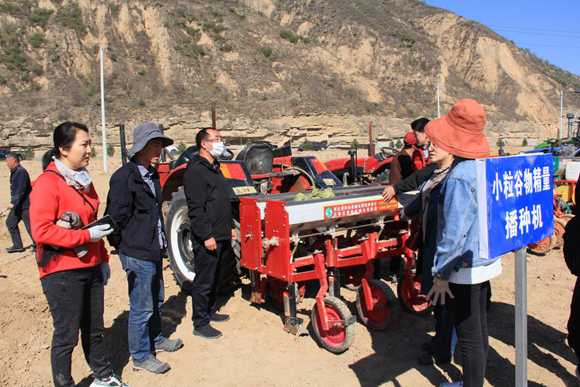 在演示会现场,专家们详细介绍农机具功能和特点,并逐一演示深松整地机械、旋耕机、谷子精量播种机、大豆-玉米间作机械、甘薯地膜覆盖播种机等农机具操作。延安小杂粮产业研发中心主任袁宏安研究员详细介绍了小粒谷物精量播种机、智能仿形谷子中耕机和小型中耕施肥机、免间苗播种机等的操作要领、机具特点、使用方法、保养等相关要点,并回答了与会人员提出的各种问题。陕西省产业体系专家,我校杂粮育种与高产生理生态创新团队负责人冯佰利教授全程参加了演示会。
