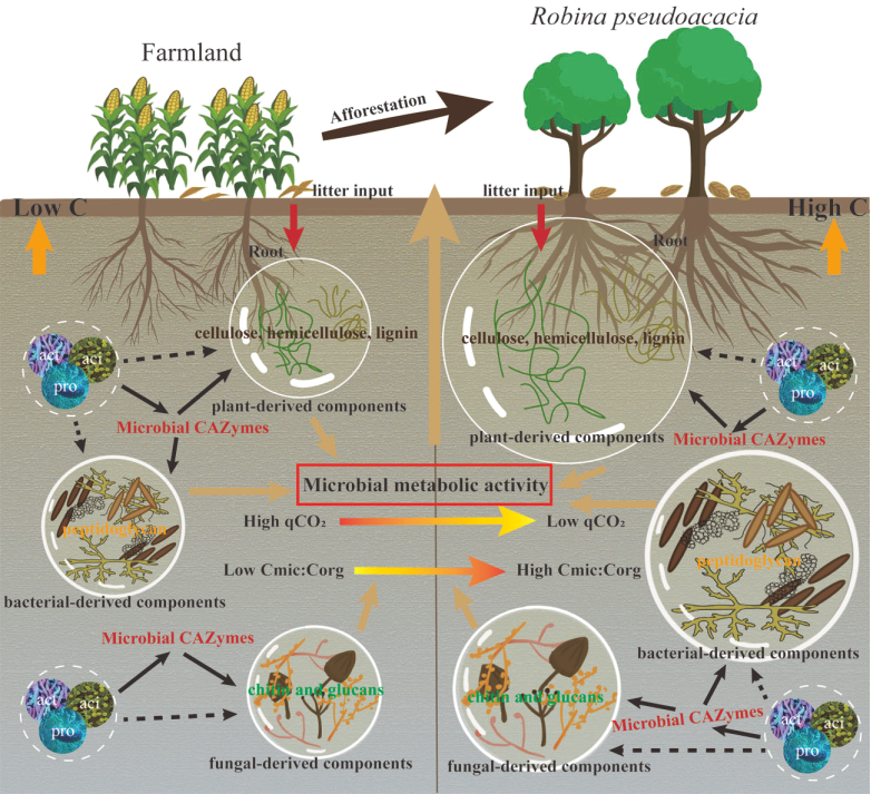 另外,土壤微生物在参与碳分解的同时,也以微生物残体形式在土壤固存,促进碳库累积并影响土壤碳库的平衡。为此,研究团队以黄土高原45年来刺槐恢复序列土壤为研究对象,利用宏基因组测序技术,研究了土壤微生物碳水化合物活性酶(CAZyme)的趋势及其对不同来源死亡生物量分解的反应。结果表明:在植树恢复过程中降解植物和微生物残体的土壤微生物CAZyme家族显著增加,在恢复中期达到峰值。就土壤微生物残体成分而言,编码细菌残体(肽聚糖)的CAZymes的丰度大于编码真菌残体(几丁质和葡聚糖)的丰度,并且与微生物代谢活动密切相关,研究证实了植树恢复过程中土壤细菌死亡残体对土壤碳周转的重要性。上述发现在理论上拓展了土壤微生物调控碳固存的研究体系,在实践上为“双碳”背景下准确预测人工林恢复中土壤碳储量提供新的视角。