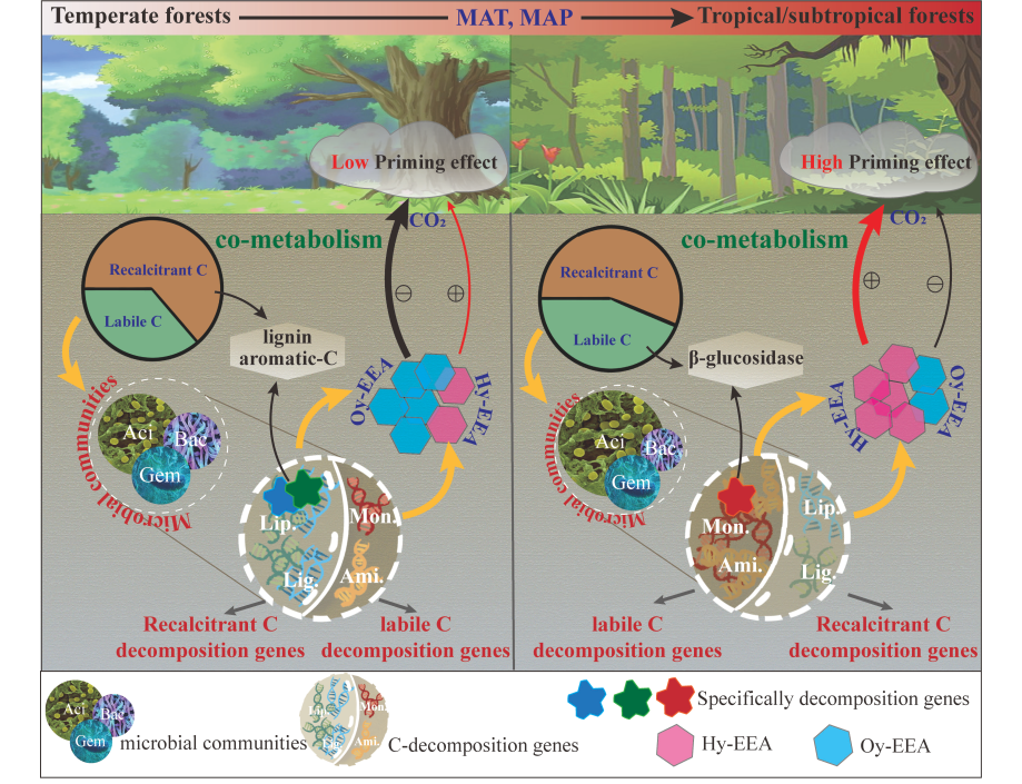基于此,研究团队沿3425 km的中国东部南北样带森林土壤开展大尺度取样,结合室内13C同位素标记实验、地球化学分析以及宏基因组测序等手段,揭示了土壤有机碳激发效应及微生物驱动机制。结果发现:土壤微生物碳分解基因是调控热带到寒冷温度地区土壤碳激发效应降低的关键因素,其作用超过了传统的植被、土壤和气候属性。并且在温带森林中,参与木质素和芳香等化合物降解的基因与有机碳激发呈负相关,而在热带/亚热带森林中,活性碳分解基因特别是注释β-葡萄糖苷酶的基因与有机碳激发呈正相关。在基因筛选基础上,首次重建了与有机碳激发相关的42基因集,并分选了部分参与碳分解的新物种。研究工作强调了土壤微生物机制对有机碳激发效应的关键调控作用,相关结果为模型预测全球变化背景下土壤碳库的动态变化提供了重要科技支撑。